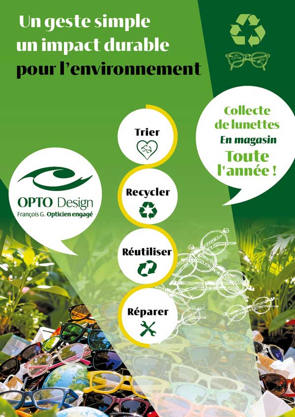 Chez OPTO Design, nous pensons qu’il est de notre responsabilité, en tant qu’opticiens, de limiter l’impact écologique de notre activité. C’est pourquoi nous avons créé notre recyclerie de lunettes, en partenariat avec Recycloptics, la seule association nationale dédiée au recyclage dans la filière optique-lunetterie.